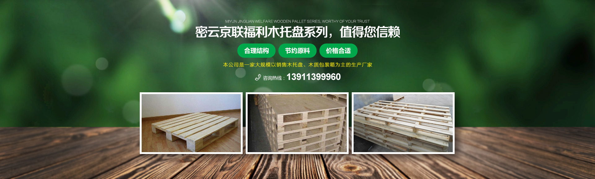 北京京聯(lián)國(guó)順木制品有限公司 (原北京市密云縣京聯(lián)福利木制品廠)成立于1993年,位于北京市密云縣西田各莊鎮(zhèn)蒼頭村,占地約5000平米。我公司工廠是一家大規(guī)模以銷售木托盤為主的生產(chǎn)廠家。本工廠是一家直接采購(gòu)原木,按客戶要求生產(chǎn)規(guī)格尺寸的托盤,我公司工廠位于河北省承德市有著木材加工點(diǎn),可以做到,從山上的木頭下山到客戶手中的托盤都是一手貨,減少了中間商的費(fèi)用,所以我公司售出的產(chǎn)品對(duì)北京這個(gè)龐大的市場(chǎng)來(lái)說(shuō)在同樣的規(guī)格尺寸的托盤來(lái)說(shuō)價(jià)格比較占優(yōu)勢(shì)。
